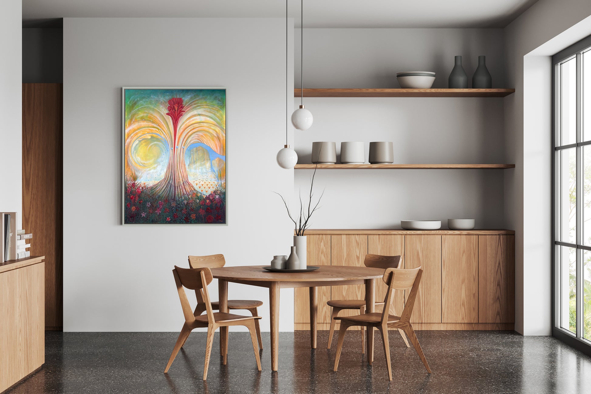 "The Clearing" presents a vivid interplay of color and motion, harmonizing natural themes with a sense of dynamic energy. The compositional choice to focus on a central organic form reminiscent of a large plant or tree effectively anchors the viewer's gaze, creating a focal point from which the rest of the artwork radiates. The use of swirling lines in yellow, orange, and green around a red structure adds a sense of vibrancy and life, echoing the often unpredictable flow of nature. This energetic flow serves as a visual metaphor for the ever-changing, interconnectedness of the natural world, drawing the viewer into a swirling dance of color and form.